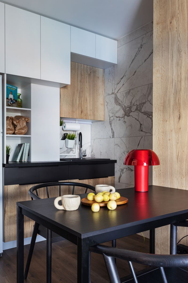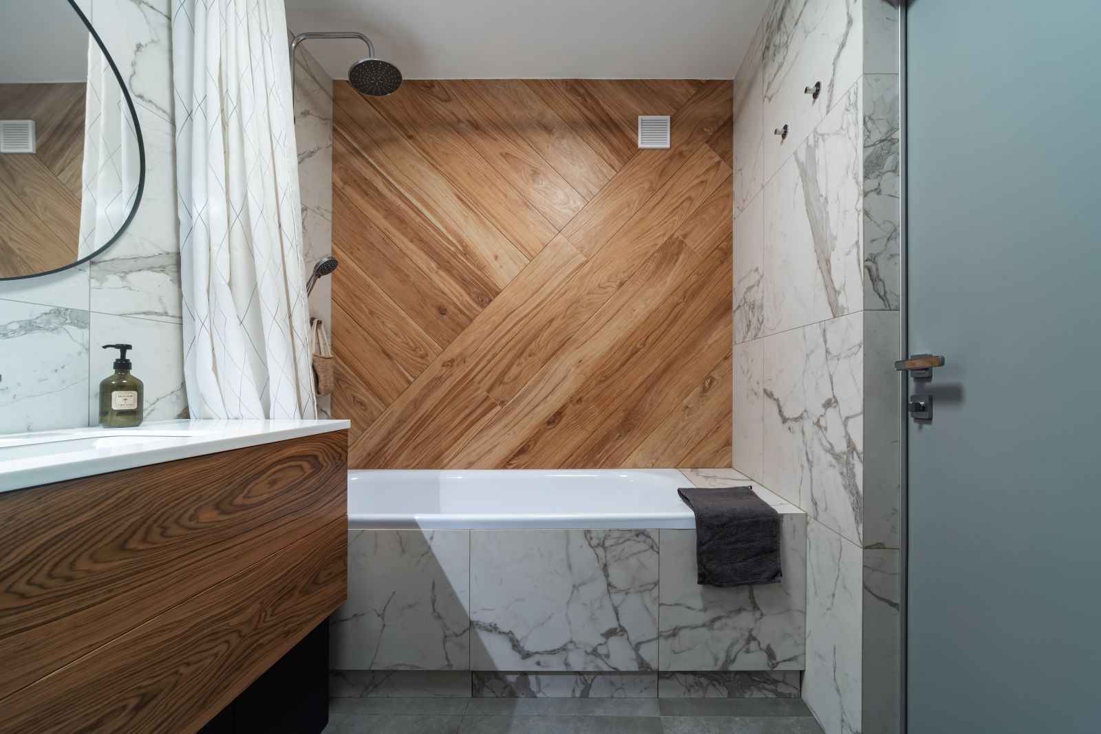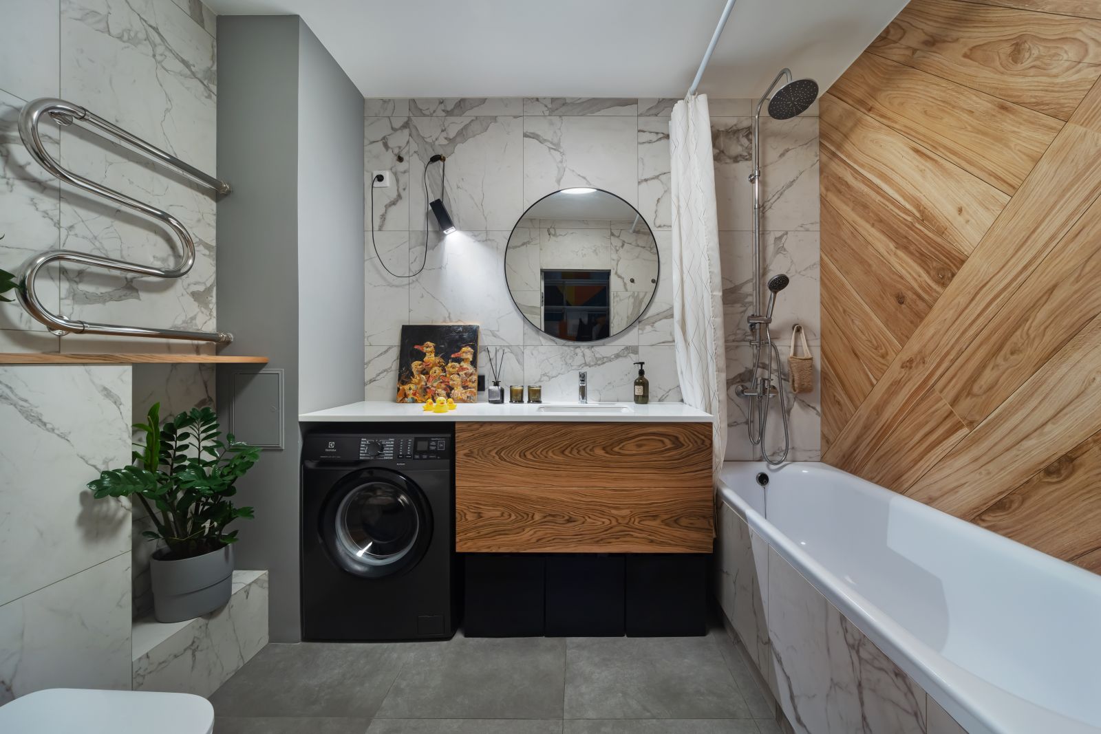 Реализованный проект санузла и фартука из керамогранита под мрамор Шарм Эво Статуарио и керамогранита под дуб Лофт Хани.